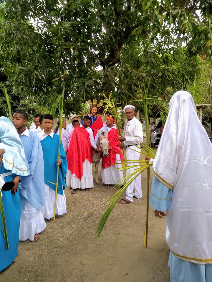 Allí visten y montan a Jesús, imagen tallada y anatómicamente articulada, sobre un burro vivo, con un bello ramo de cogollos de Palma de Vino. El Nazareno Mayor escoge a 4 Nazarenos para que vestidos de sayones acompañen a las imágenes durante los ritos del día. Celebrada la misa a las 10 de la mañana, viene la “Bendición de los Ramos”, y palma que bajo el rigor de manda y sacrificio los Nazarenos, vestidos igual al Viernes de Dolores, venden a los fieles para fondo de la Hermandad y gastos rituales de la Iglesia.