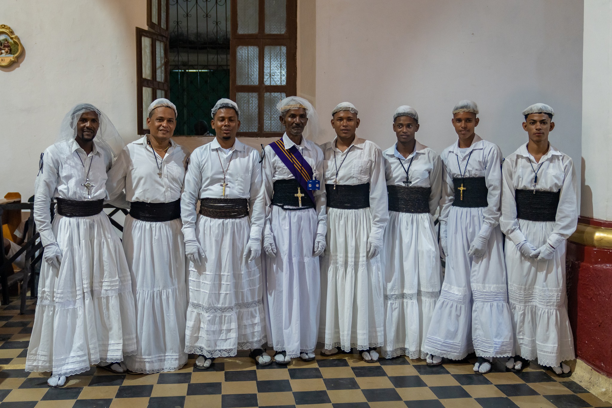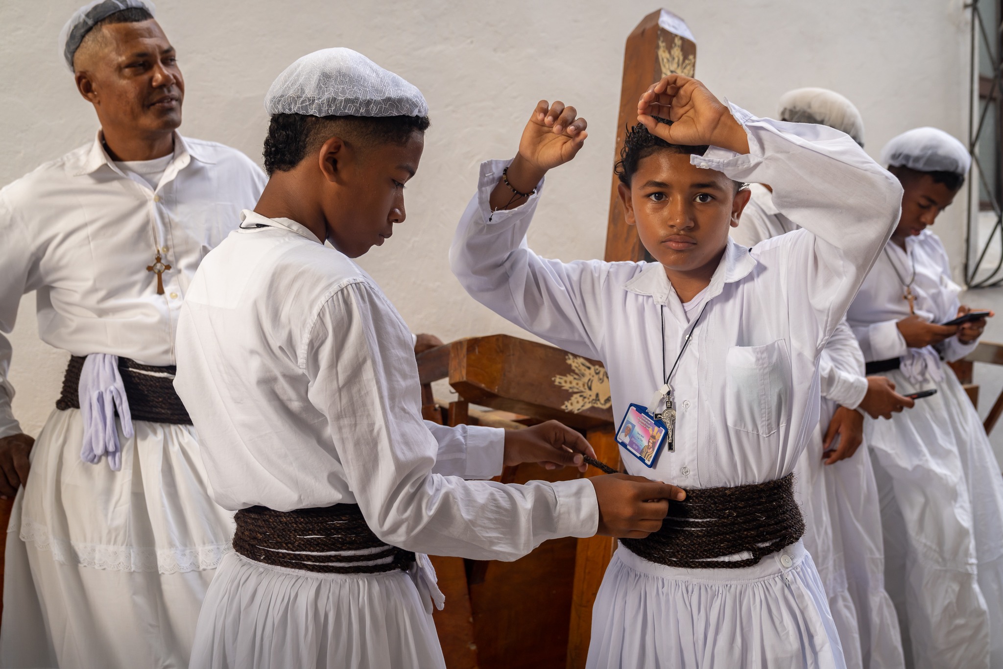 Comienza con la llegada rigurosa, 7:00 a.m. de los Nazarenos viejos y nuevos para vestirse ritualmente en el patio lateral de la Iglesia. Colocada por primera vez de la falda blanca, que cae hasta los pies; se cumple en grupos de dos o tres el “amarre del Cordón” o soga trenzada con pelo o crin de caballo o de burro, de una pulgada de diámetro. Los Nazarenos lo hacen ayudados por los viejos, sosteniendo la soga de cada novicio que de pie y manos en alto va girando sobre si mismo mientras el cordón se enrolla alrededor de su cintura hasta una cuarta con el tórax, simulando un ancho fajón que aprieta y martiriza durante todo el día, pues la soga es la “Prueba de la Consagración” que al quitársela el Nazareno queda el tórax en carne viva.