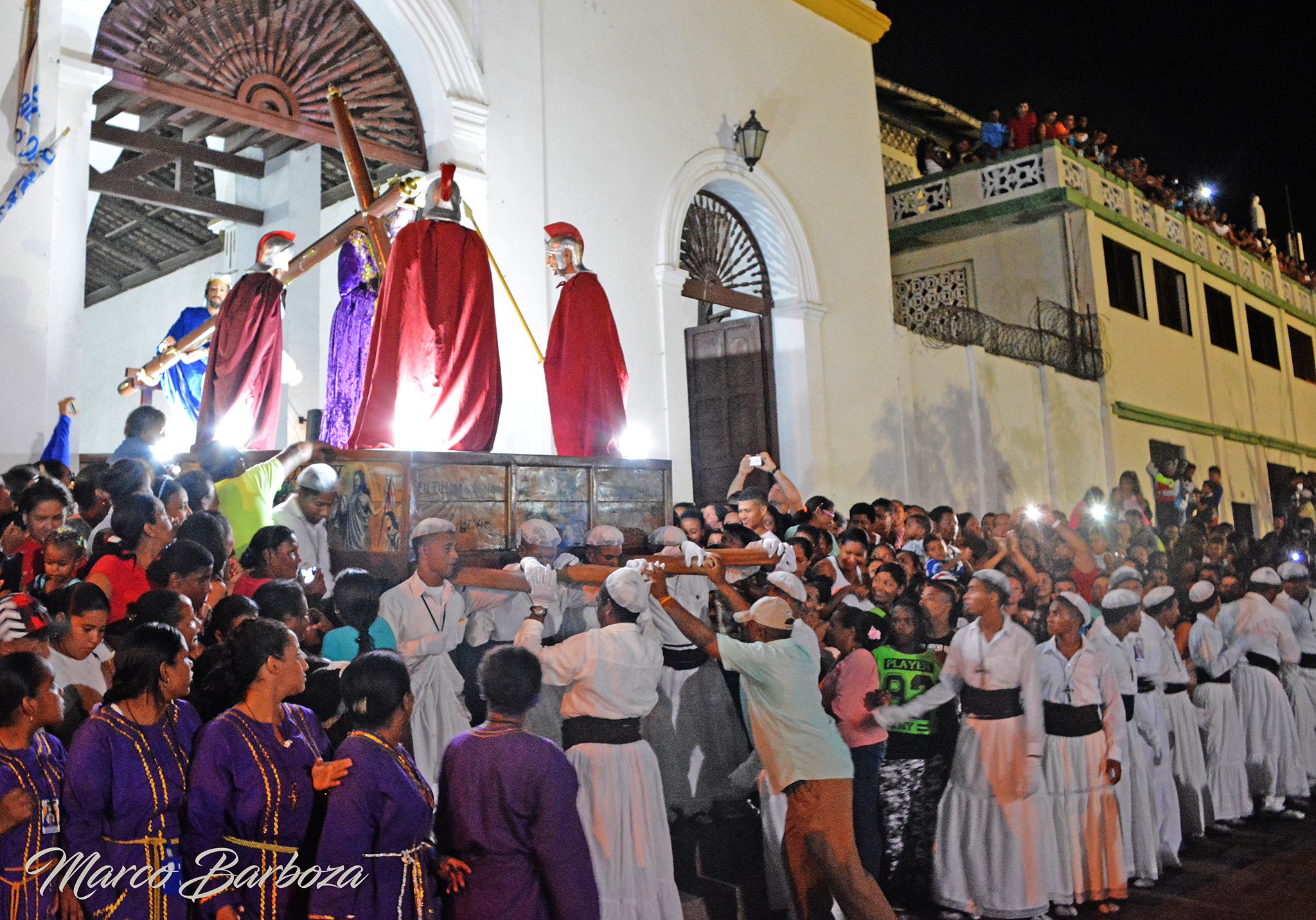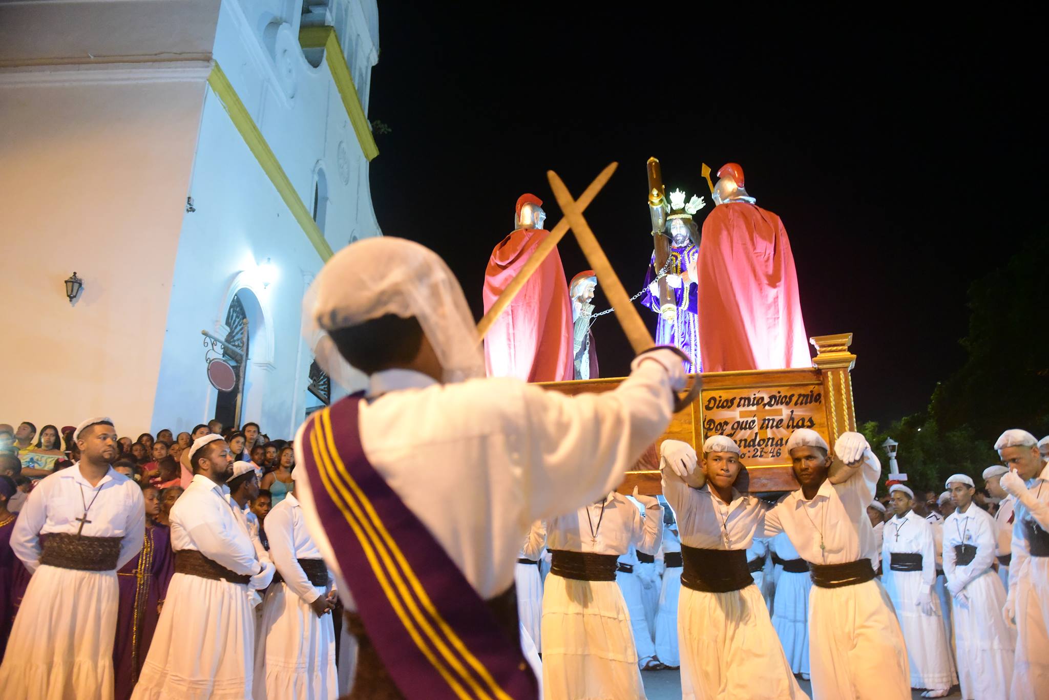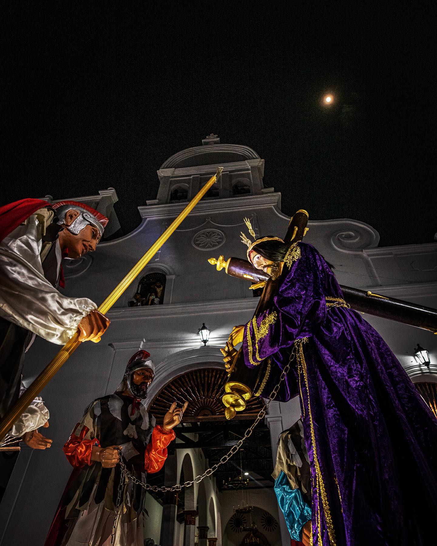 A las 12 de la noche frente a la Iglesia, una vez suenan los acordes de la Marcha El Duelo, comienza a salir el monumento religioso de la más grande, abigarrada, compacta y controvertida procesión: Jesús Nazareno mirando a su pueblo de frente, con rostro de dolor, con su túnica morada, llevando a cuestas la cruz y rodeado por tres soldados intimidantes.