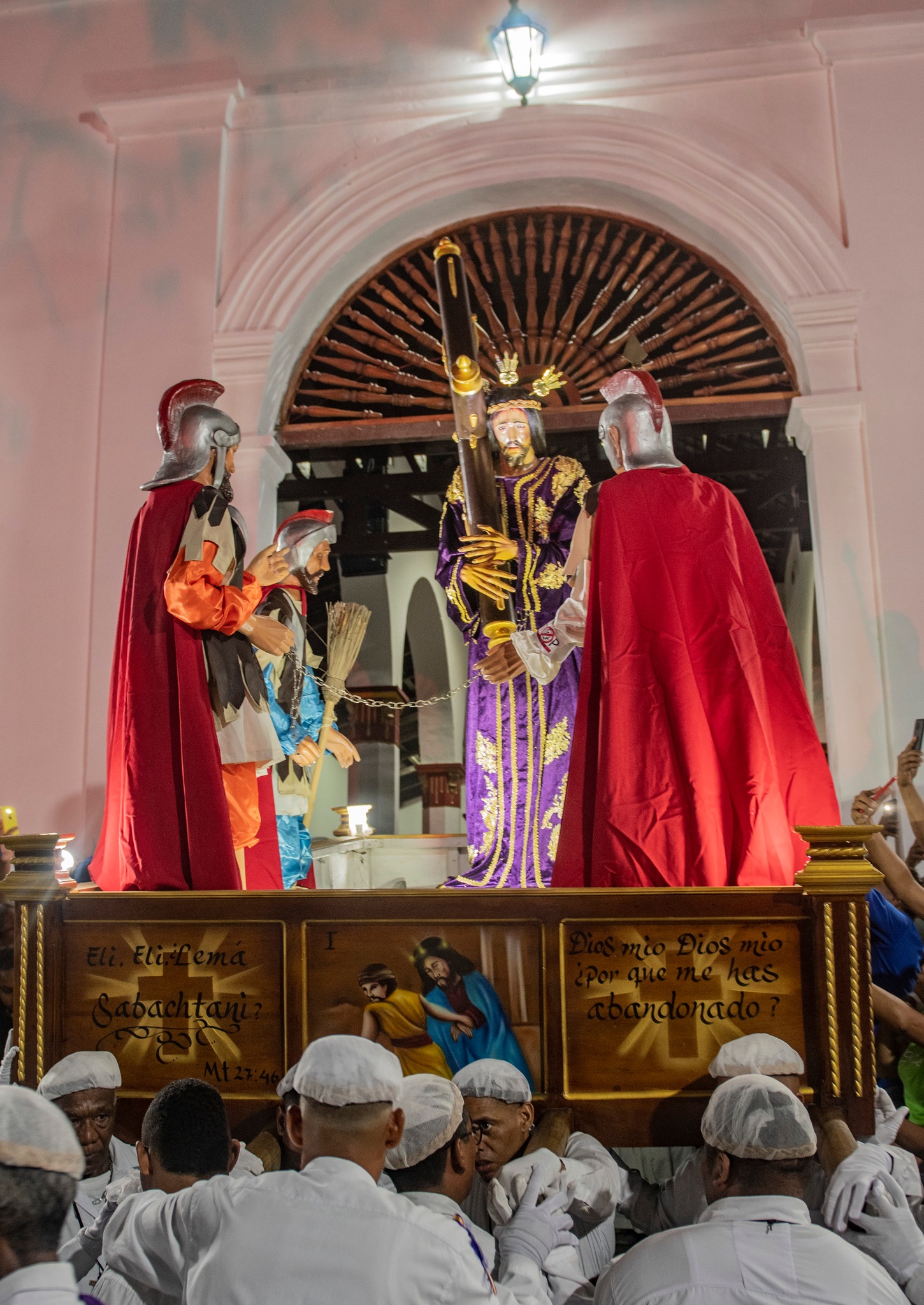 Los nazarenos la cargan a la salida de la iglesia, y una cuadra después, luego de aproximadamente 1 hora, se la entregan al pueblo, pero permanecen vigilantes en todo momento. Durante su largo recorrido tienen lugar las siete estaciones o caídas del Señor; en esos momentos que dura cada una media hora, dejamos descansar el paso grande con sus imágenes en los banquillos o burros de madera en los sitios tradicionalmente señalados.